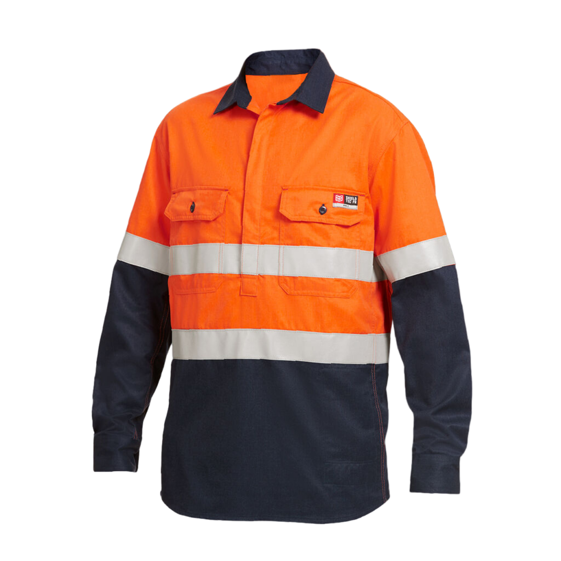 KingGee Men's Shieldtec Fr Hi Vis 2 Tone Closed Front Taped Shirt - Orange/Navy