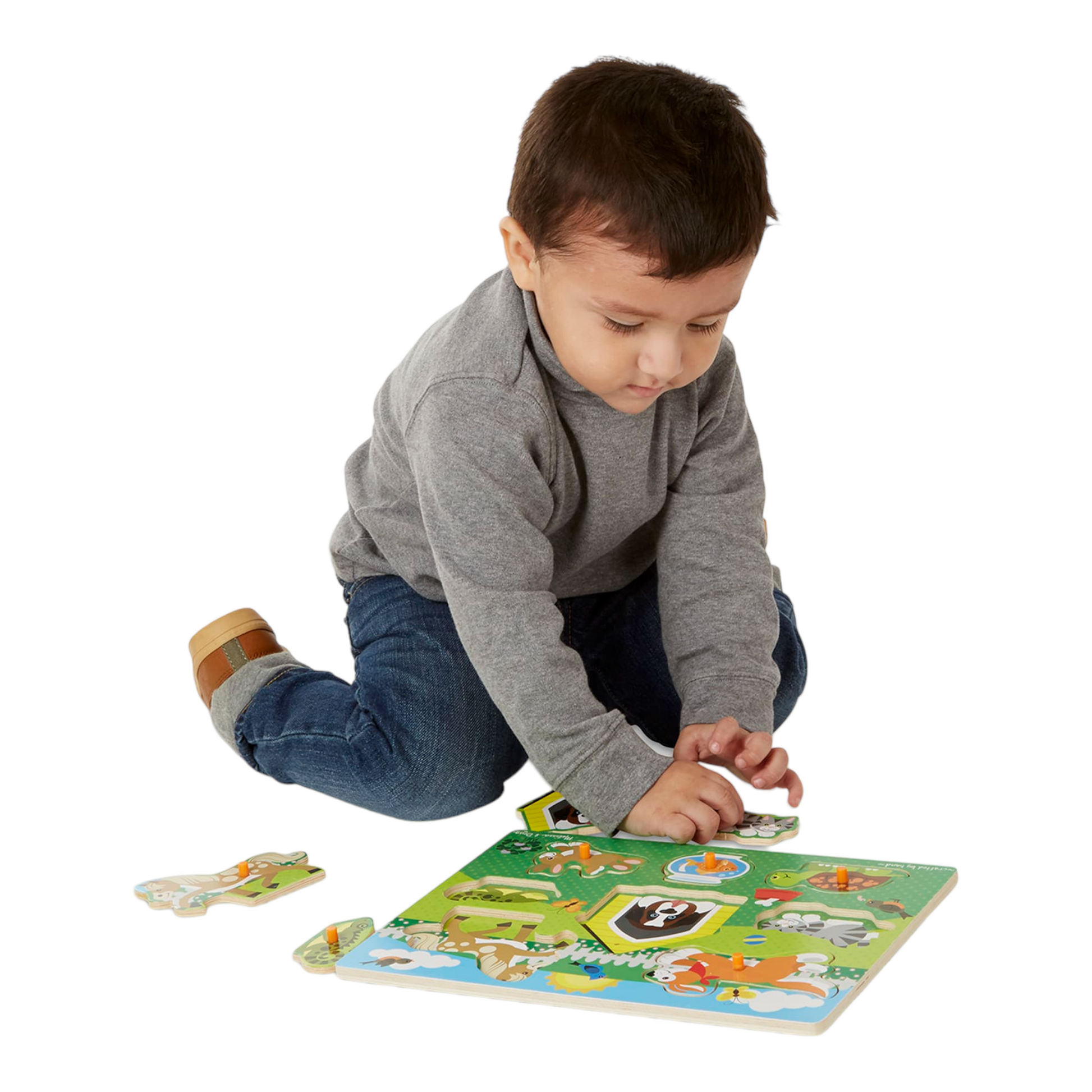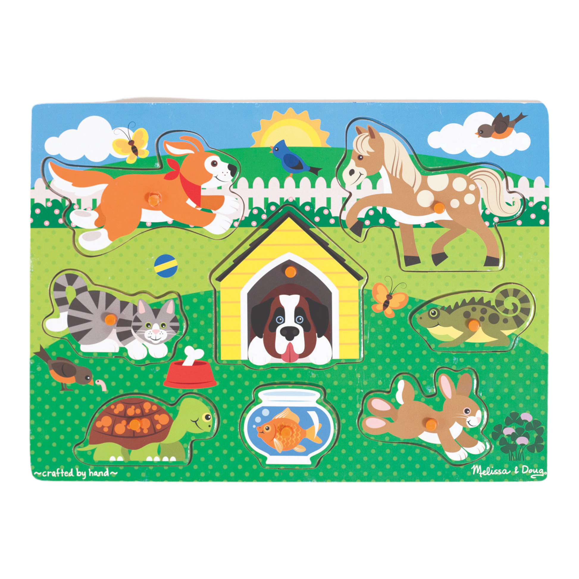 - Easy-grasp 8-piece peg puzzle with a pets theme