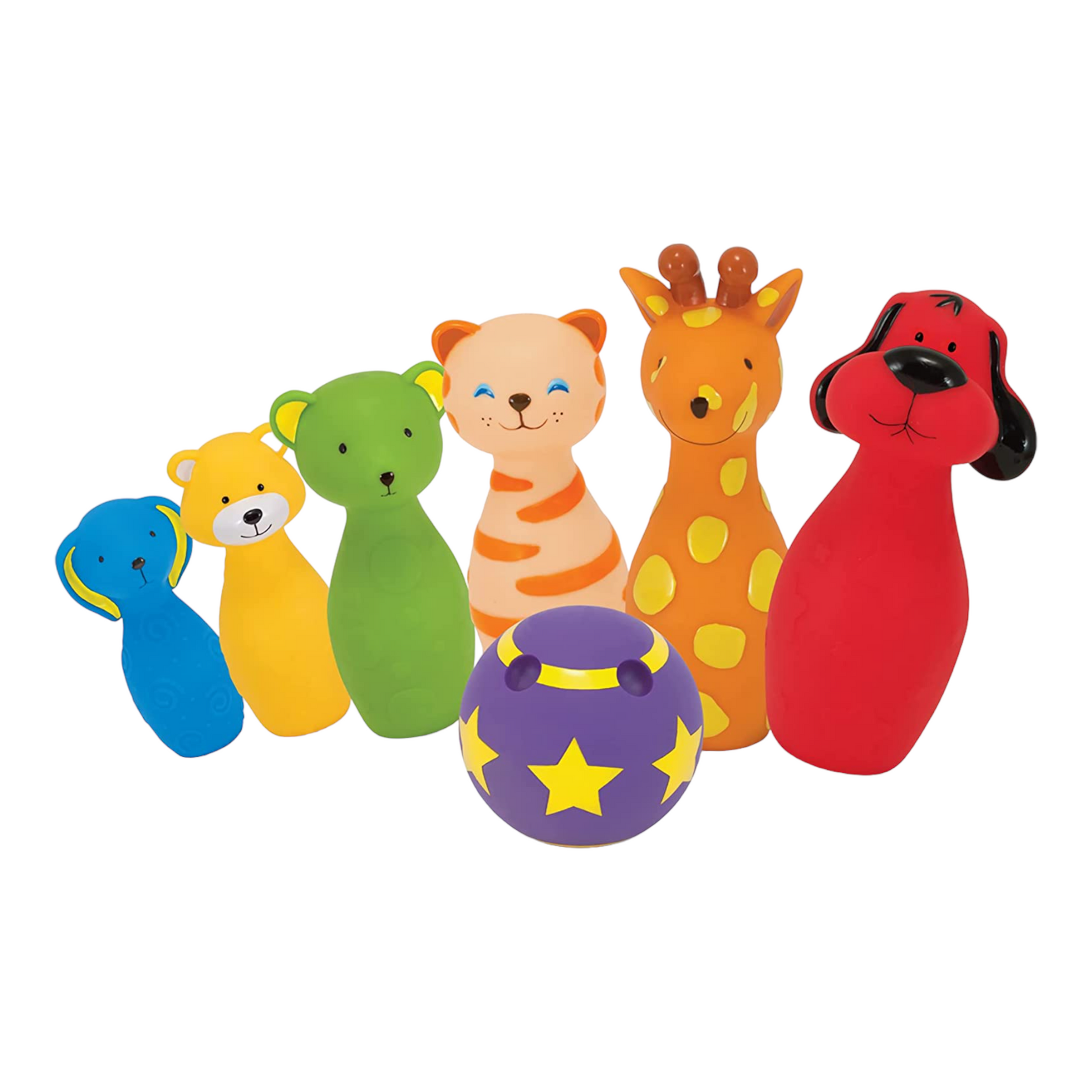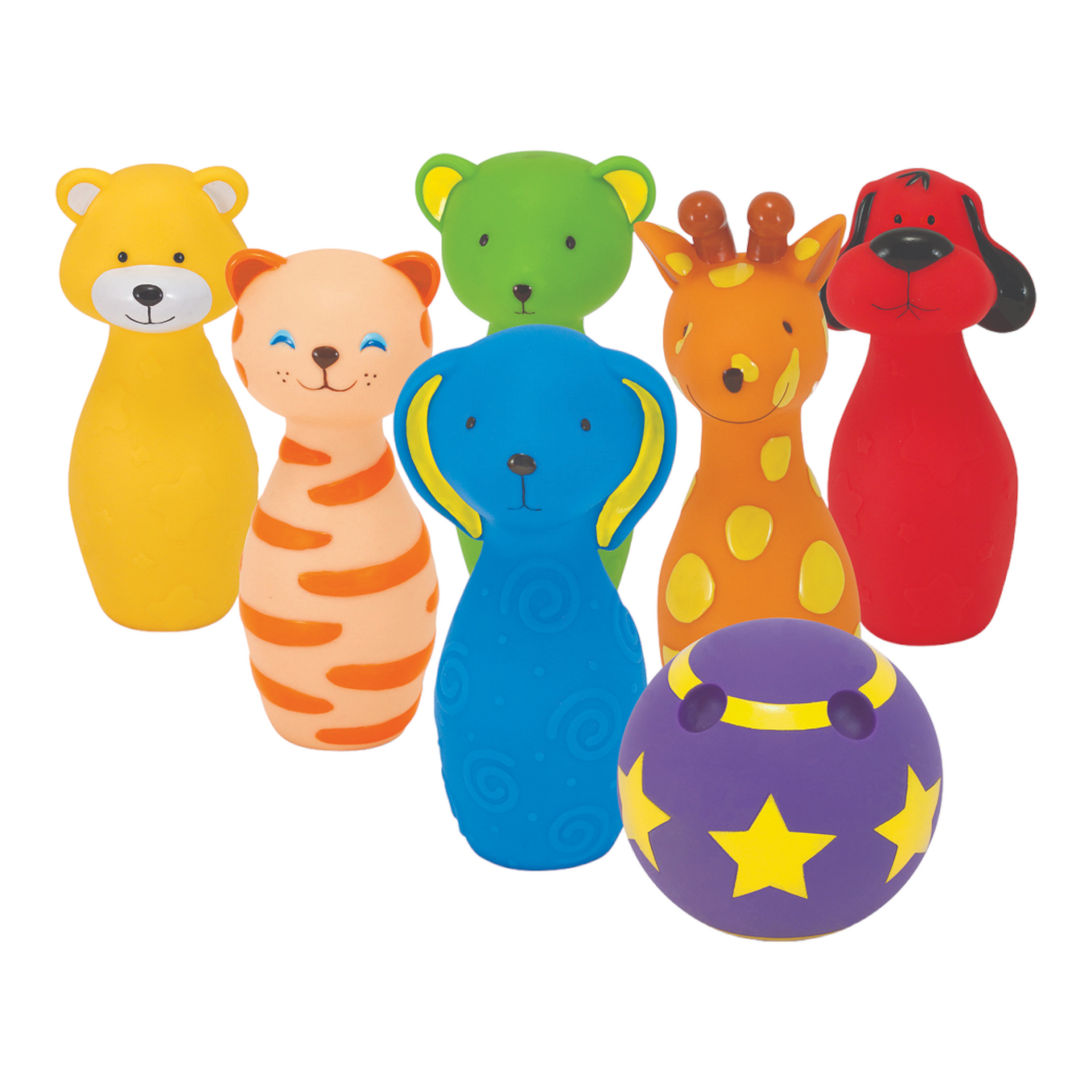 - 7-piece soft-plastic bowling set for toddlers and preschoolers