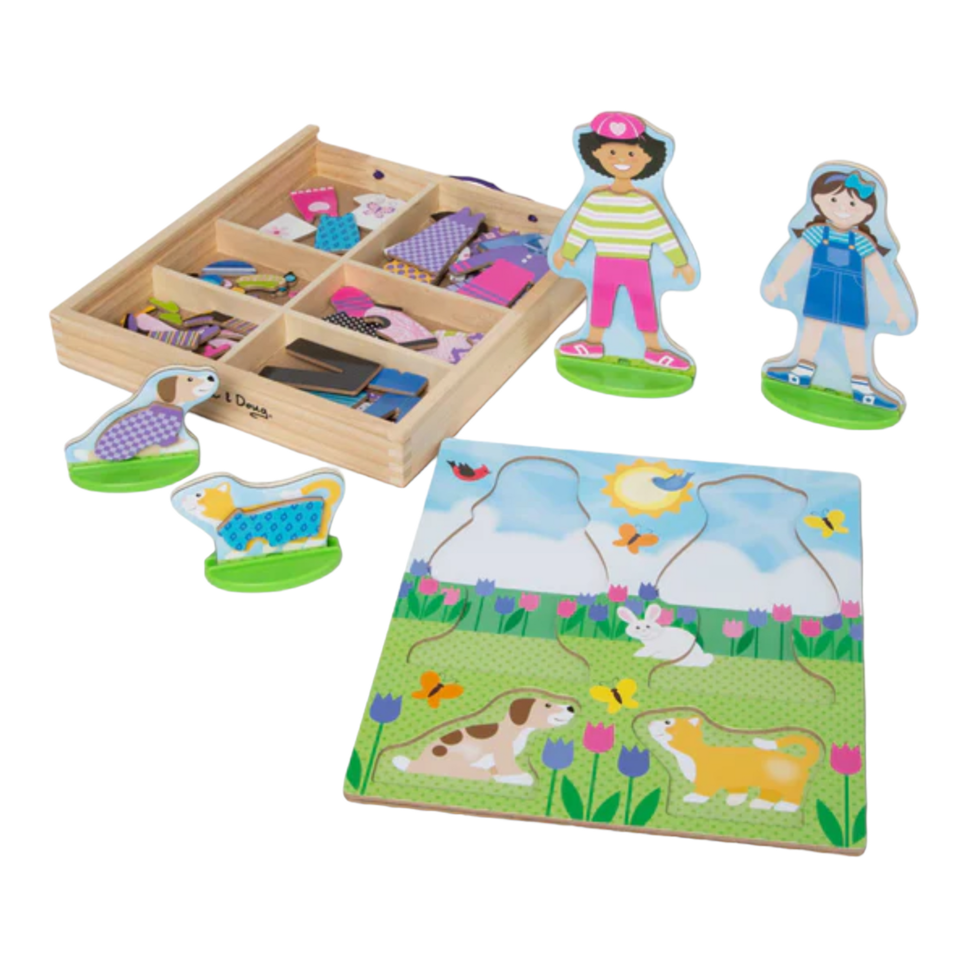 Combine dozens of magnetic pieces in coordinating designs to dress two friends and their two pets (a precious puppy and cute kitten) to tell stories about these best friends! Mix and match coordinating magnetic clothing and accessories to dress the dolls. The dolls, each with a durable stand for pretend play, and the pieces all store in a sturdy wooden tray with a slide-in lid and convenient carrying handle to take the fun on the go! This unique dress-up dolls set helps kids three and older develop hand-eye coordination and fine motor, counting, and sorting skills, and encourages creative expression and imaginative play.